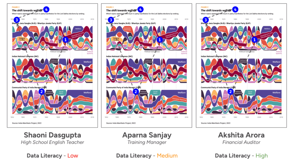 My team member’s feedback came to me as a surprise, and brought up a lot of questions in my head. How could I create data visualisations that better aid the process of information discovery for my audience? What role does their data literacy play in the consumption of a data visualisation? How do these data visualisations adapt to the social development space and context? And does building data visualisations for the Indian subcontinent look different to other widely accepted practices?