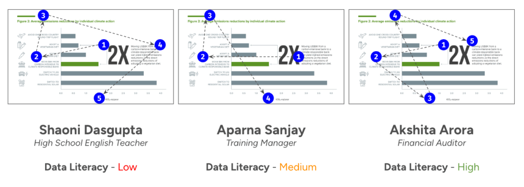 Creating effective data visualisations requires a nuanced understanding of not only your audience’s level of comprehension, but also their relationship with the information presented. Here, for example, the respondents more often related to the first visualisation based on their personal perspectives of reducing emissions, rather than following the key insight presented. It therefore becomes important to understand the information your audience is currently working with, and what key problems they are trying to solve. Meeting the reader at their level ensures that the visualisations are accessible and meaningful, fostering a connection between the data and the audience’s experiences.