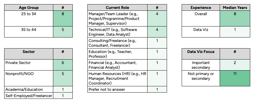 - 6 respondents worked in the private sector, 5 in non-profits/NGOs, 1 in academia, and 1 was a freelancer.