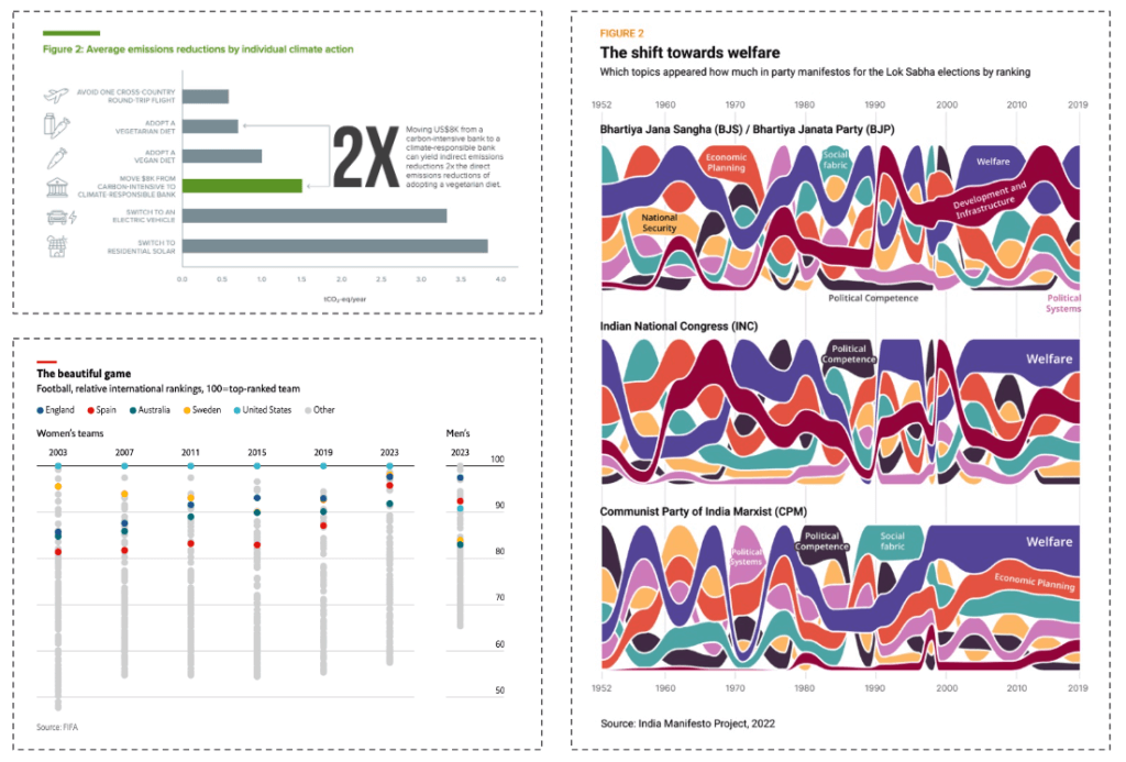 Variety in complexity: The data visualisations ranged from simple charts with clear messages and takeaways to more abstract representations of data.