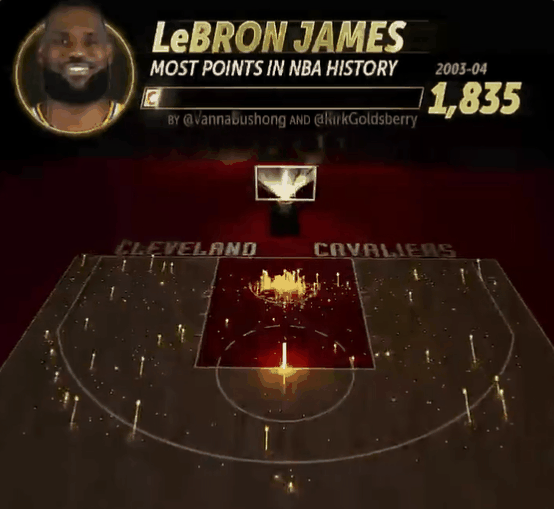 • Intro: My pick this month is from NBA analyst Kirk Goldsberry. This animated visualisation shows all the shots Lebron James made from 2003 to 2023.