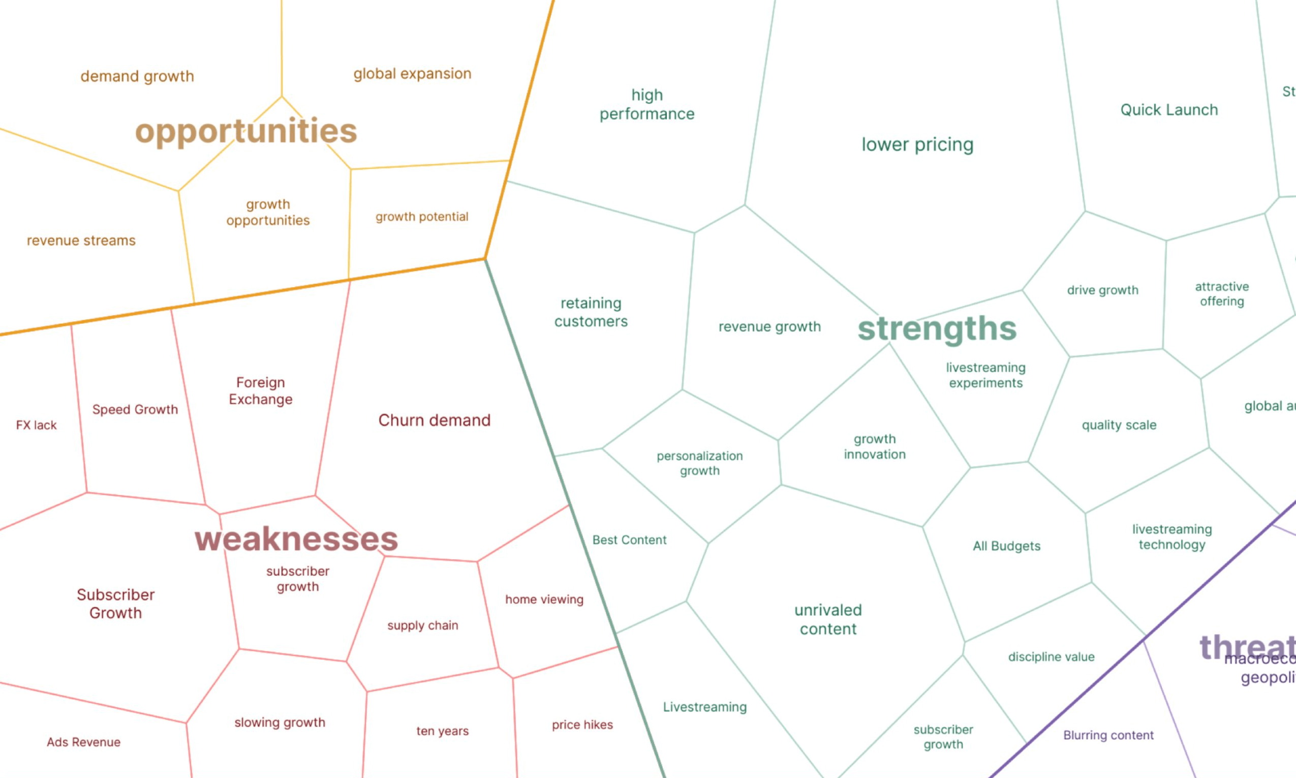 • Why it matters:  Voronoi treemaps have always been a particular interest of mine. They have some great characteristics when it comes to dataviz.First, they can fit into any figure; it could be a circle, polygon or even different logo shapes. Second, changes can be made easily with the animation, which is particularly useful in dynamic and interactive applications. Third, if we add labels, they can be easily understood and always attract interest from the user.Considering these characteristics, it’s not a surprise that this particular choice of visualisation works so well in this context. We can easily see and understand what the strengths, weaknesses, opportunities and threats of each company are, which makes this tool ideal for market research and/or competitor analysis.