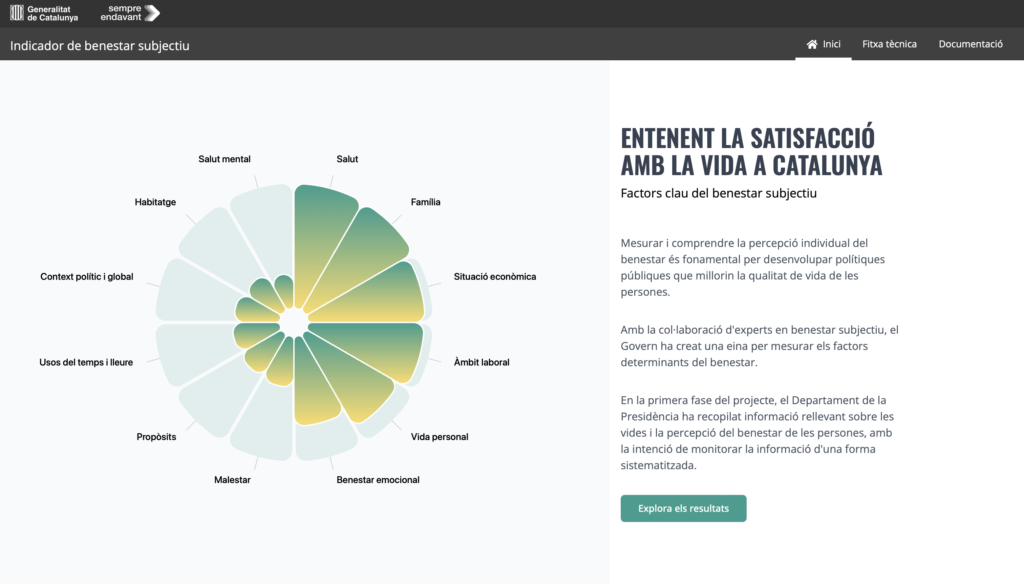 - Intro: Measuring and understanding individual perceptions of well-being is fundamental to developing public policies that improve people’s quality of life. Here, Catalonia’s Department of the Presidency has collected relevant information on people’s lives and perceptions of well-being to monitor this information in a systematised way. With the collaboration of experts in subjective well-being, the local government has created a tool for measuring the determinants of well-being. The platform includes data and information about various metrics, such as health, education, and social indicators, specific to the Catalonia region. Users can then gain insights into overall quality of life and societal progress through appealing storytelling and eye-catching interactive data visualisations.