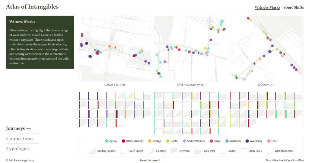 - Intro: The Atlas of Intangibles is an exploratory visualisation that documents the mundane sights and sounds captured by designer Priti Pandurangan on walks in different parts of London. From graffiti to the sound of the neighbourhood dog barking, there’s no doubt that going beyond sight gives us a better sense of what these places feel like.