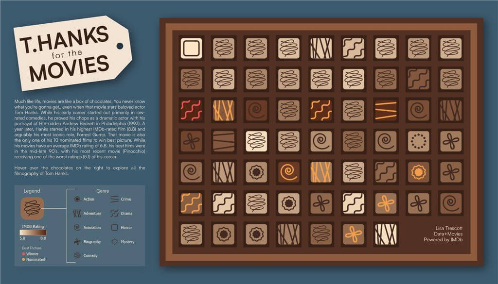 - Intro: I love this example of a data art style visualisation, visualising each one of Tom Hanks’ films individually in glyph style to create a box of chocolates. The design choice of each movie representing a different chocolate in a box of Tom Hanks movies seems simple, but it’s so well done. It’s genius, I love it!It’s also a great example of disaggregating data to show differences and similarities across each individual data point. The eye-catching design works well as a static dataviz, which would lend itself perfectly to a poster format, drawing in the reader to explore and understand the symbols behind each chocolate. Going deeper, the online Tableau version offers tooltips containing further information about each film.