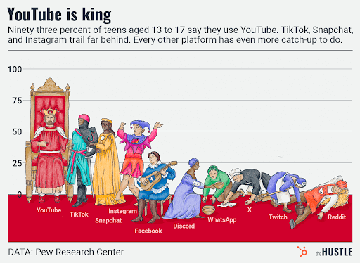 - Intro: This chart visualises the supremacy of YouTube among teenagers based on 2023 survey data by the Pew Research Center. The data shows that 93% of teens use YouTube, with 71% visiting the site daily.