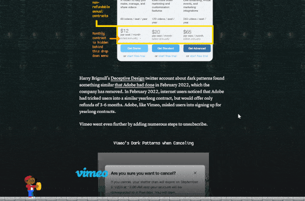 • Intro: You know the drill. You’re enticed into yet another online subscription service, be it Canva or craft beer). You diligently mark your calendar for when your free trial runs out so you don’t get charged full-whack. Surely there’ll be a simple ‘Cancel My Subscription’ on your account dashboard….This 8-bit-themed scrolly story from The Pudding reveals one journalist’s journey through the mire of ‘dark patterns’ – the shady tactics that subscription providers use to keep us paying.