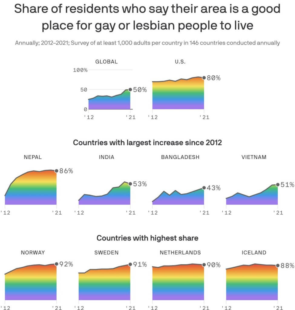• Intro: June marks the start of Pride month. Staggeringly, 64 countries in the world still criminalise homosexuality, with some even serving the death penalty. So yes, we do still need Pride. Thankfully, data visualisation can help us lift the lid on progress being made across the world. This example from the Axios news desk shows the share of residents who say their area is a good place for gay or lesbian people to live, based on a 10-year study from 2012 to 2021.