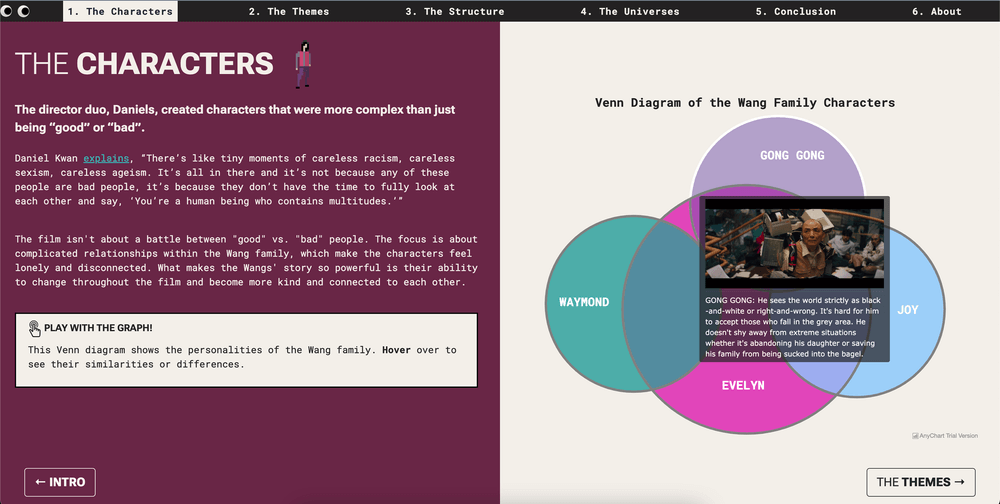 • Intro: As part of her thesis project, Angelica Hom created an insanely in-depth analysis of the award-winning movie, Everything Everywhere All At Once. Her visualisation presents a data experience that walks you through the movie’s themes and characters.