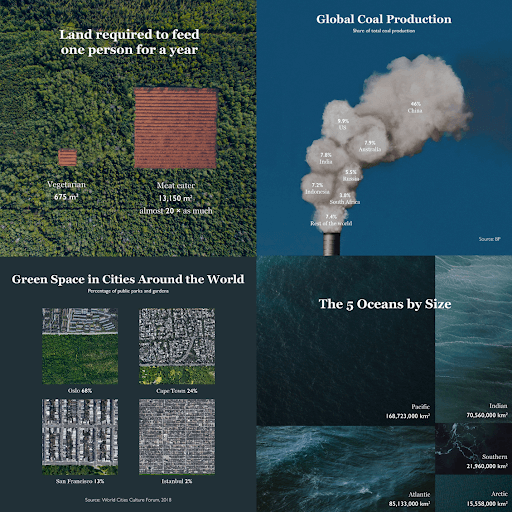 • Intro: Is data visualisation only graphs and charts? Absolutely not! We can communicate data stories in many ways – the best option is sometimes simple, while other times out-of-the-box thinking is needed to strike a chord with the audience. These series of photo-based visualisations by Ferdio are great examples of how this technique done correctly can help audiences to understand the context of the compelling stories quickly, all while maintaining the clarity of the data itself.
