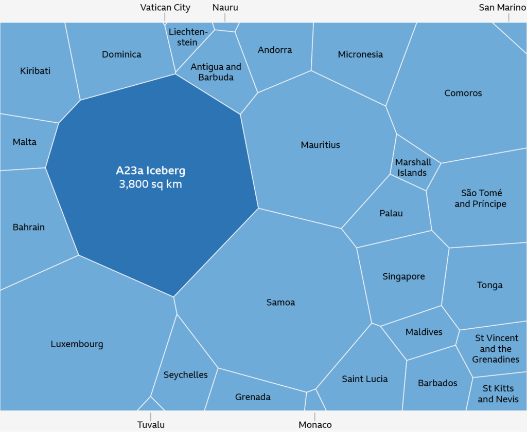 - Why it matters: If this Iceberg were an island, it would be bigger than Luxembourg or Mauritius. It’s tall too, standing at 280m high (for reference, the Shard in London is 310m). This isn’t just a story of climate change, though; the story and the truth has much more nuance. What happens when icebergs ‘die’? Is it because of climate change? Is it all bad news? (Hint: icebergs contain 100,000 year-old mineral dust that gives life to the sea, from great whales to plankton)