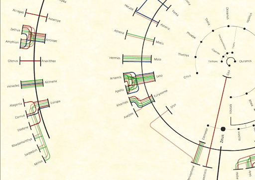 - Why it matters: Visualisations of relationships have always been a source of fascination for me, as has Greek mythology. The design is striking yet simple, too: the inner ring shows goddesses, the outer ring shows humans; the inner side of each arc shows lovers, the outer side shows children. And the connected lines even show mentions of the characters by various authors throughout (human) history.