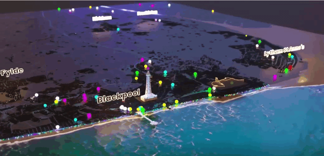 • Intro: Have you ever seen such an engaging bus timetable? Craig Taylor at Ito World has revamped his visualisation of the UK’s Bus Open Data Service (or BODS for short) to coincide with the famous Blackpool Illuminations, this time using innovative 3D mapping. Three things stood out to me here: (1) the modern presentation of the data nodes to cleverly ‘illuminate’ the topic; (2) the blend of highlighting what’s important to make the information easy to digest and subtle details to make the visuals pop; (3) the real-world 3D perspective to make the data more relatable and tangible.
