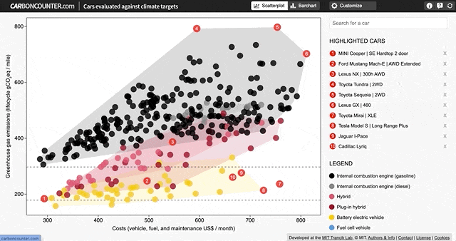 • Intro: Aimed at car owners and drivers in the US, this exploratory visualisation from Carbon Counter helps the user understand just how close (or far away) your model of car is from the emissions targets set by the US government for 2030 and 2040. Emphasis does need to be placed on ‘exploratory’, though, particularly when you open up the ‘Customise’ menu. You can tailor the tool to look at a multitude of scenarios of your choice, and even to focus in on your home state.