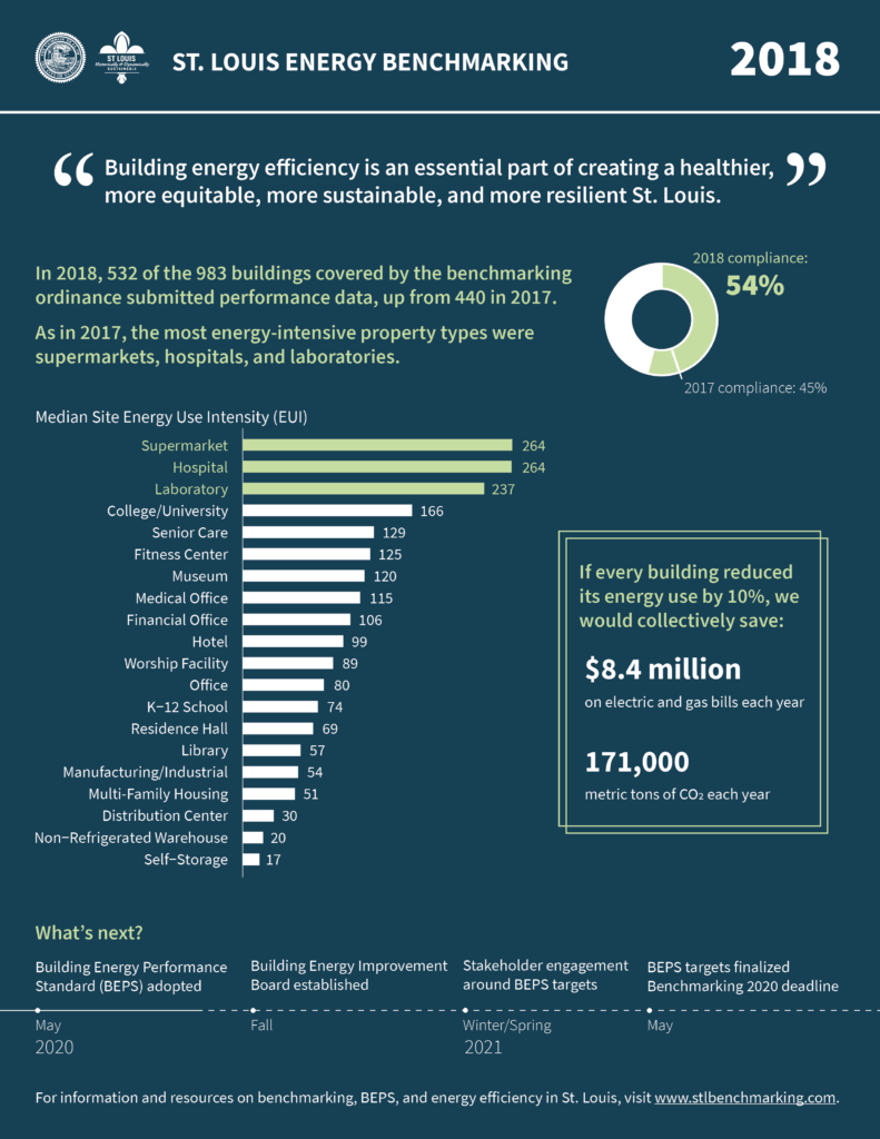 For this reason, our building energy scorecards called out two specific benefits likely to be of interest to different types of building owners—cost savings and emissions reductions. (And, more broadly, most communications about St. Louis’s building energy performance standard emphasised that the city would be only the 4th in the U.S. to enact such a policy, a point which would bring a great deal of positive attention to a city not known for being an environmental leader.)