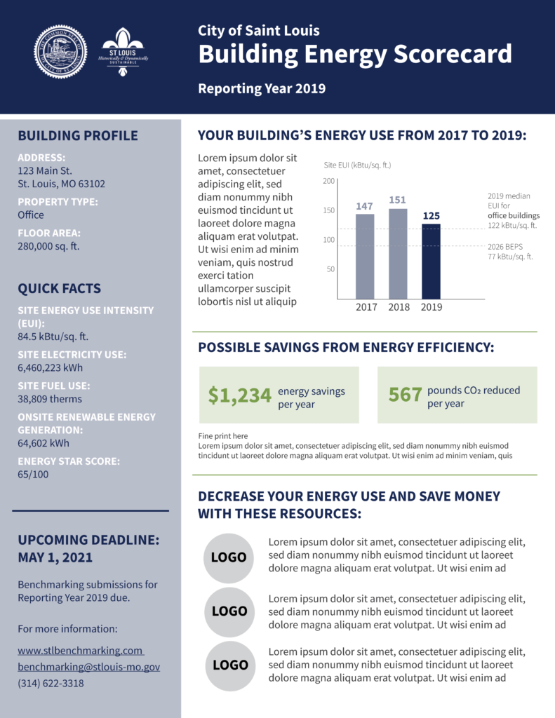 In St. Louis, once the performance standard was enacted, we wanted building owners to track their progress using one particular energy efficiency metric (site energy use intensity), which was the metric used by the standard. To comply, buildings would need to perform at a certain level by a particular year. So, to make it easier for building owners to gauge the magnitude of change needed, we created building-level energy scorecards that showed how energy efficiency at each building had changed over time and how their current performance compared to the target.
