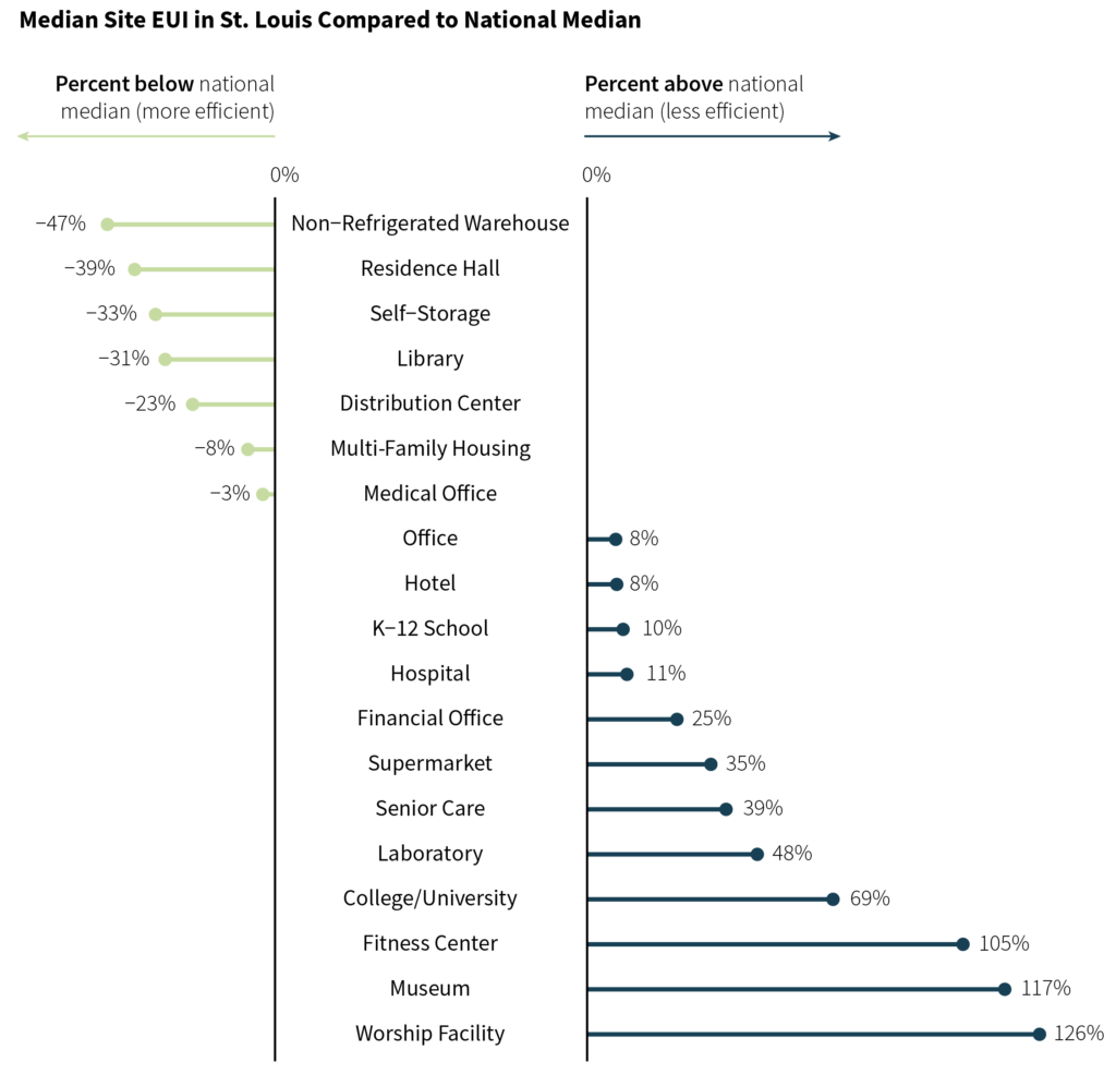 For example, when working with the data from St. Louis, I created charts comparing local data to national benchmarks, since most building types in St. Louis were underperforming relative to the comparable national median. Through the building-level energy scorecards, I also showed how each building compared to their peer buildings of the same type.