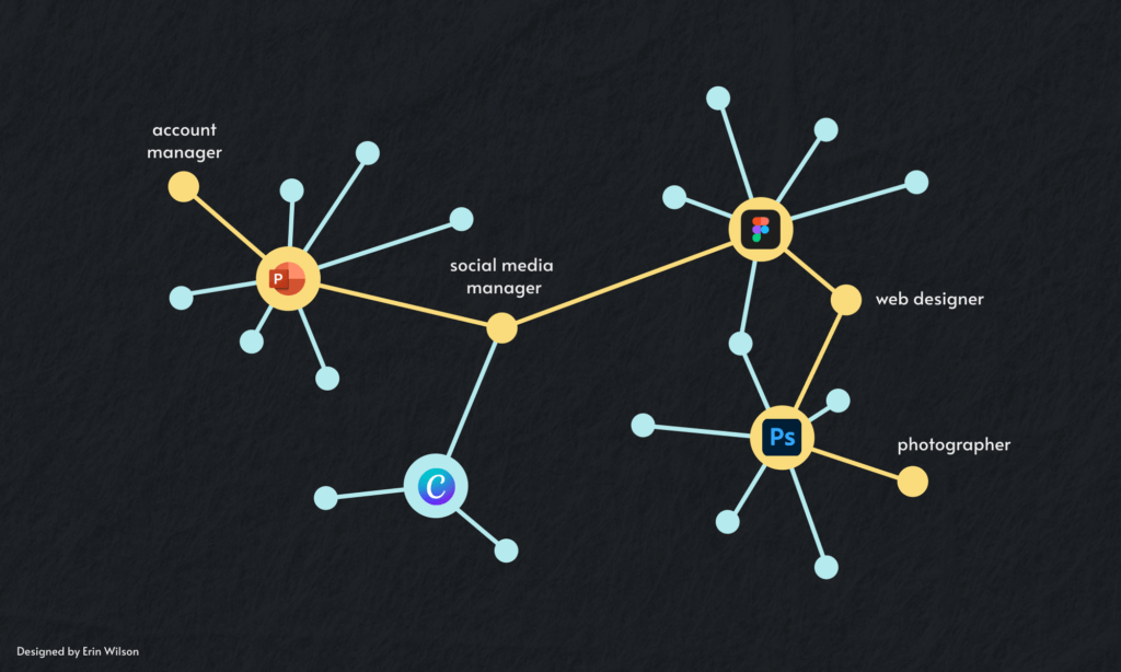 Imagine a searchable network graph that reveals how your current skills could apply to similar roles. What if the network graph showed alternative occupations that require a tool that you already have expertise in? Further insight could be drawn by connections between these different skills. If you’re already a pro with one piece of software, the graph could suggest similar software to learn that would unlock your potential to branch into new types of jobs.