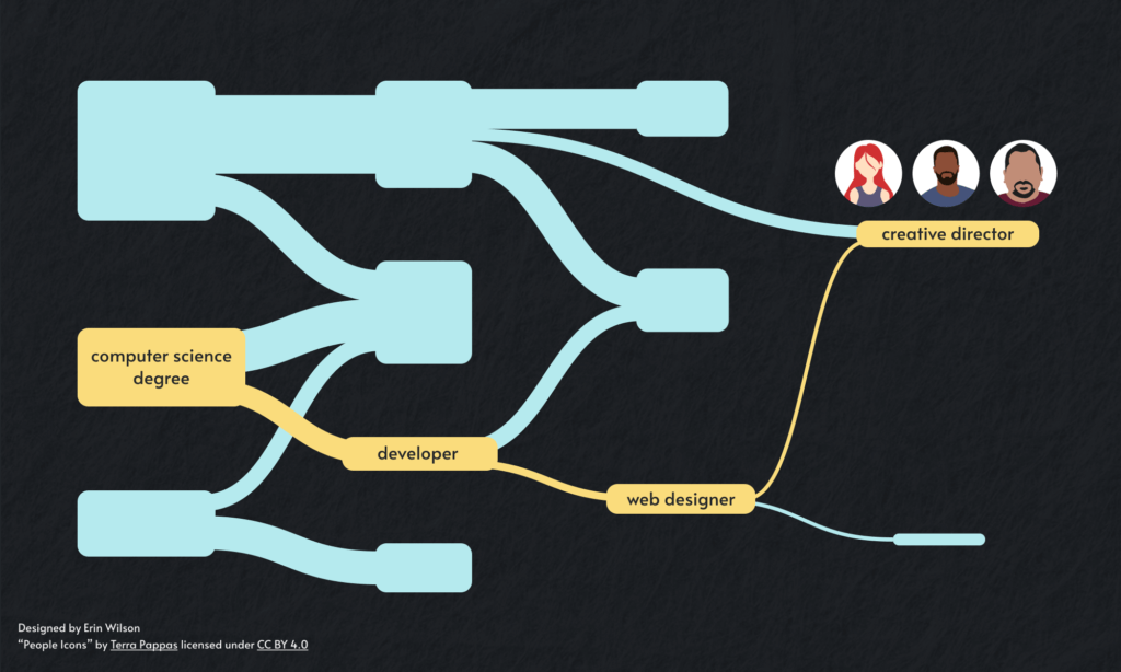 But sometimes you need to see it to believe it. Imposter syndrome is a common phenomenon that leads to thoughts like “There’s no way I could ever be a designer, I’m a developer!” These types of job-seekers could benefit from seeing how real people navigated their career, step by step. In the business world, we’re familiar with customer journey mapping. This framework could easily be applied to career journeys as well.