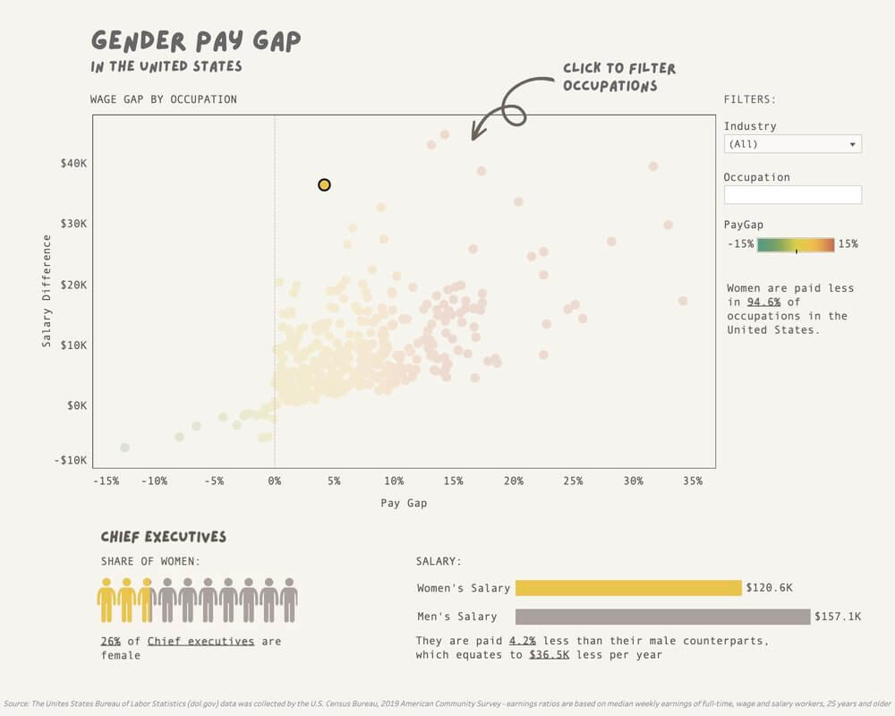 For example, below I’ve filtered for CEOs. The insights read: “26% of Chief Executives are female. They are paid 4.2% less than their male counterparts, which equates to $36.5k per year.” You don’t have to be a data person to imagine what you would do with an extra $36.5k in your annual pay packet.
