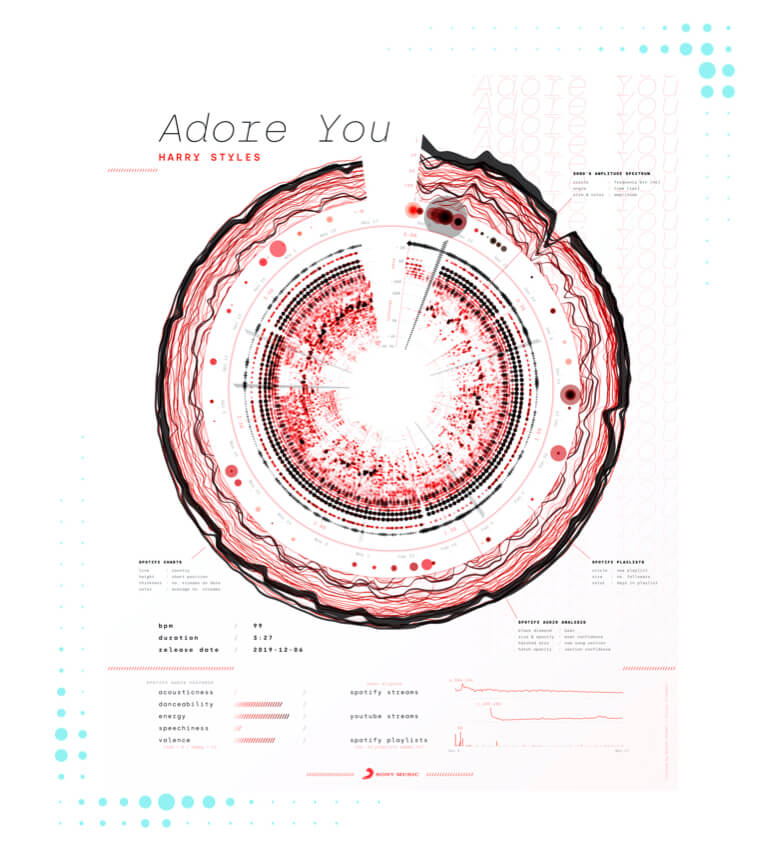There’s a tonne of data packed into each poster, from a song’s audio characteristics to its Spotify chart rank to its ‘danceability’ (yes, you can access real data on that via the Spotify API).