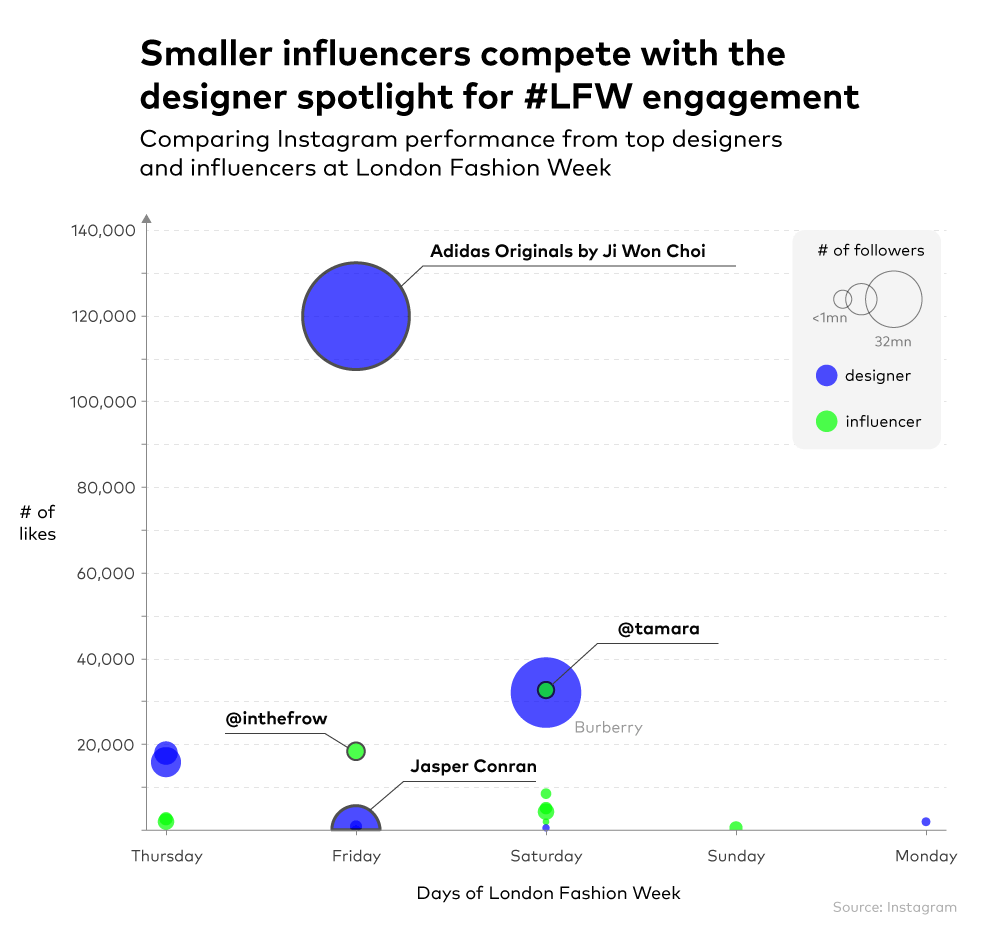 We looked at the data to get some answers. During London Fashion Week we selected a group of designers who were showcasing and compared their Instagram pages to a group of prominent Instagram fashion influencers.