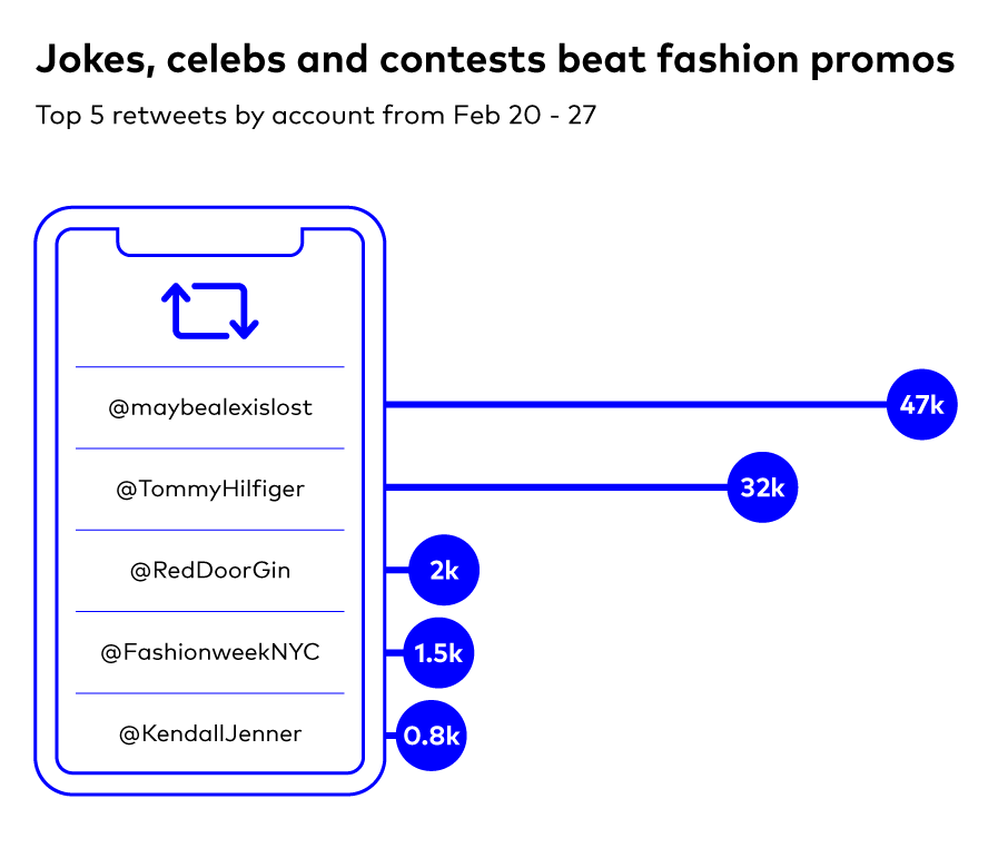 Twitter is a different beast to Instagram, with a very different influencer culture. Looking at the London Fashion Week content here was also telling. Only one fashion brand- Tommy Hilfiger- made it to the top five most retweeted. On Twitter, different types of content gain traction. The top post was from a writer who tweeted a witty comment after spotting Louis Tomlinson in the front row of the Top Shop show.