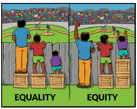 It wasn’t until I came across the following infographic that it really clicked. It shows three people standing behind a fence, each of varying heights. On the opposite side of the fence, a baseball game is being played. The tallest person enjoys an unobstructed view, while the other two struggle to see. The concept of equality suggests giving everyone the same size of box to stand on. This would allow the tallest person to see better and the middle person to have a partial view, but the shortest person would still face difficulties. Equity takes a different approach – by allocating boxes based on individual needs. In this particular situation, the tallest person doesn’t receive a box, the middle person gets one box, and the shortest person receives two boxes, ensuring everyone has an opportunity to see and enjoy the game.