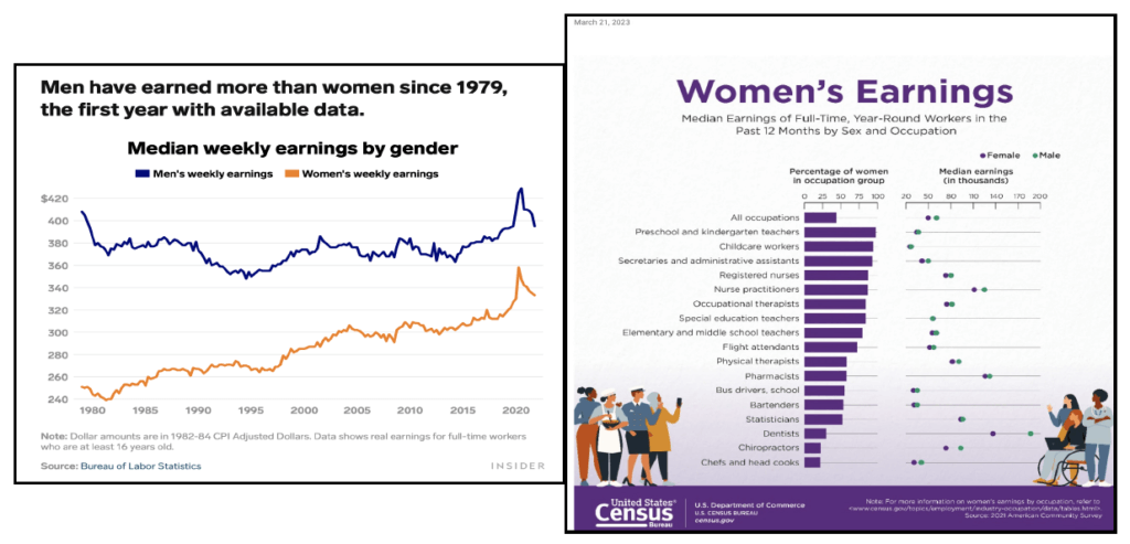 Image credits: Left: “These 8 charts show the glaring gap between men’s and women’s salaries in the US”, Business Insider; Right: “Women’s Median Earnings”, Census Bureau