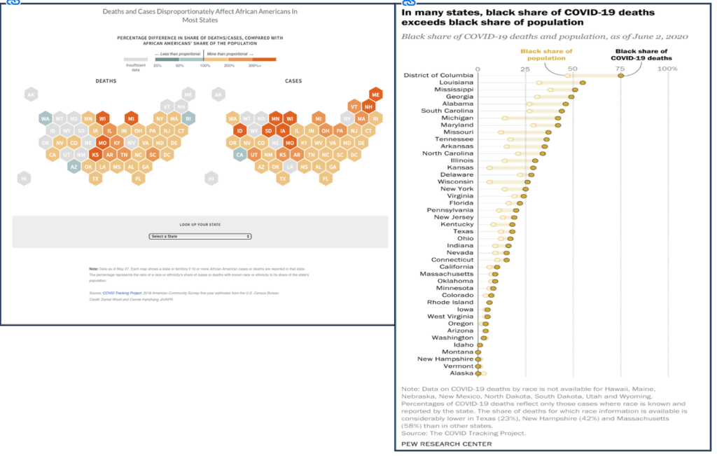 Image credits: Left: “What Do Coronavirus Racial Disparities Look Like State By State?”, National Public Radio (NPR); Right: “Black Americans face higher COVID-19 risks, are more hesitant to trust medical scientists, get vaccinated”, Pew Research Center