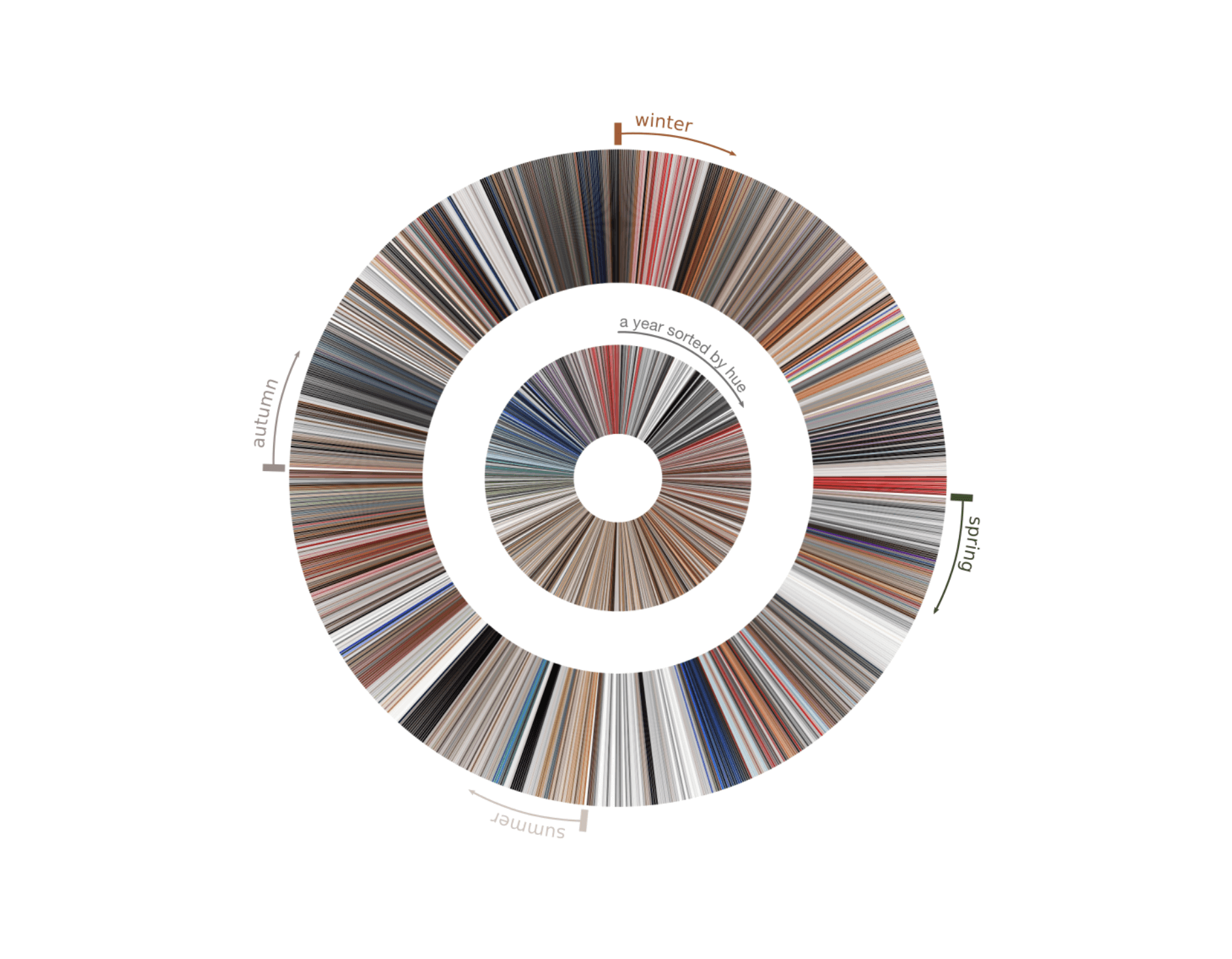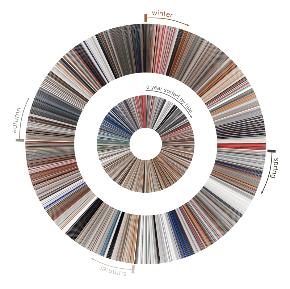 Finally, opening up the data sources pushes the limits of our understanding. New sources can be blended with existing ones. They can be aggregated into the process, in a story with different visuals or combined. On top of that, new information can be revealed. Is the colour palette of a brand changing in line with the seasons? What is the colour spectrum of our luxury brand in comparison to our competitors? We can sort our colours by hue to see the dominant colours, stick with an original timeline and combine the information altogether: