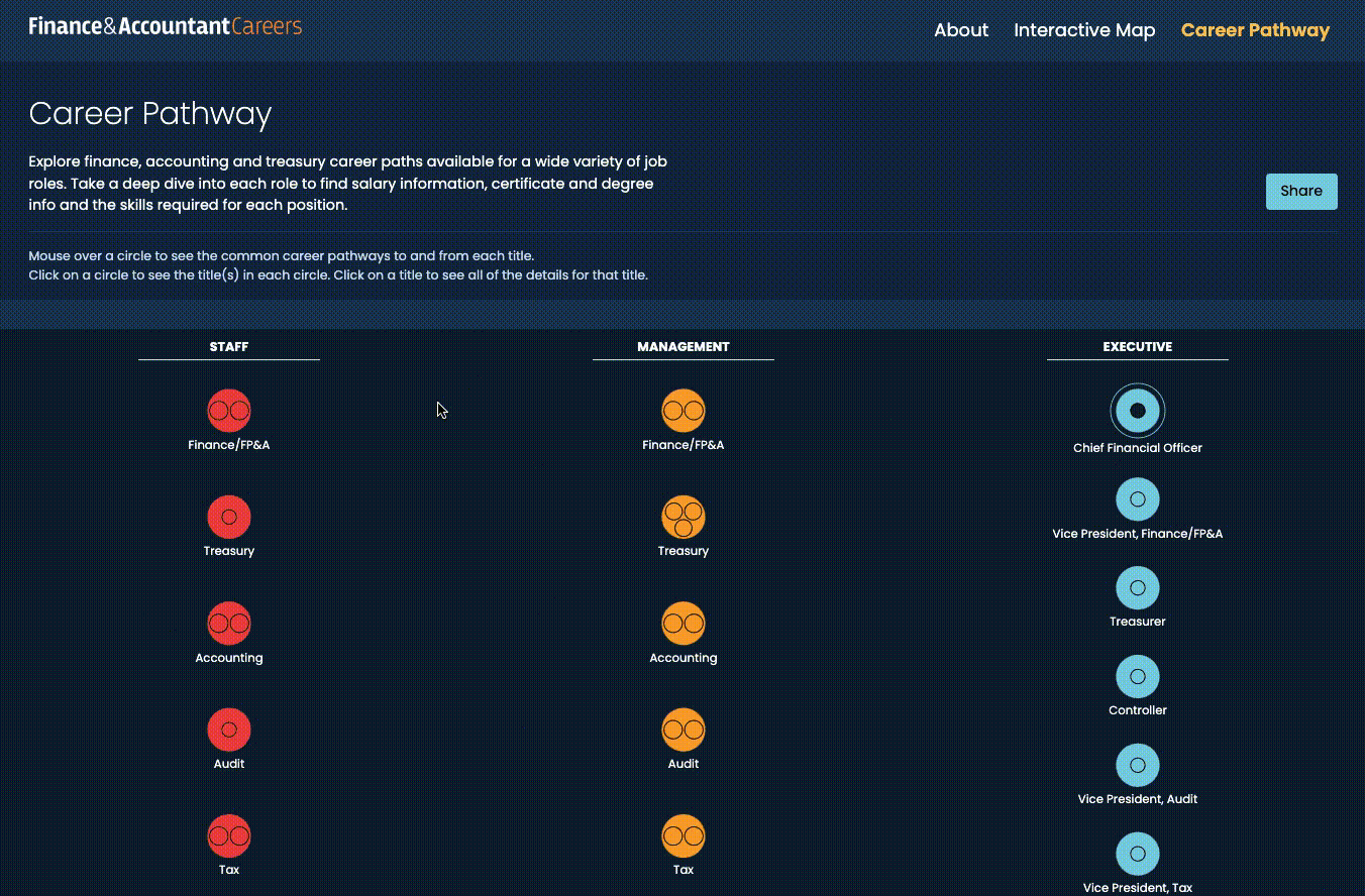 Harnessing Lightcast’s rich source of US finance labour market data and the AFP’s own member survey data on salaries, we co-developed a visually engaging and interactive insights tool that presents a detailed career view for new and existing financial professionals to progress through.