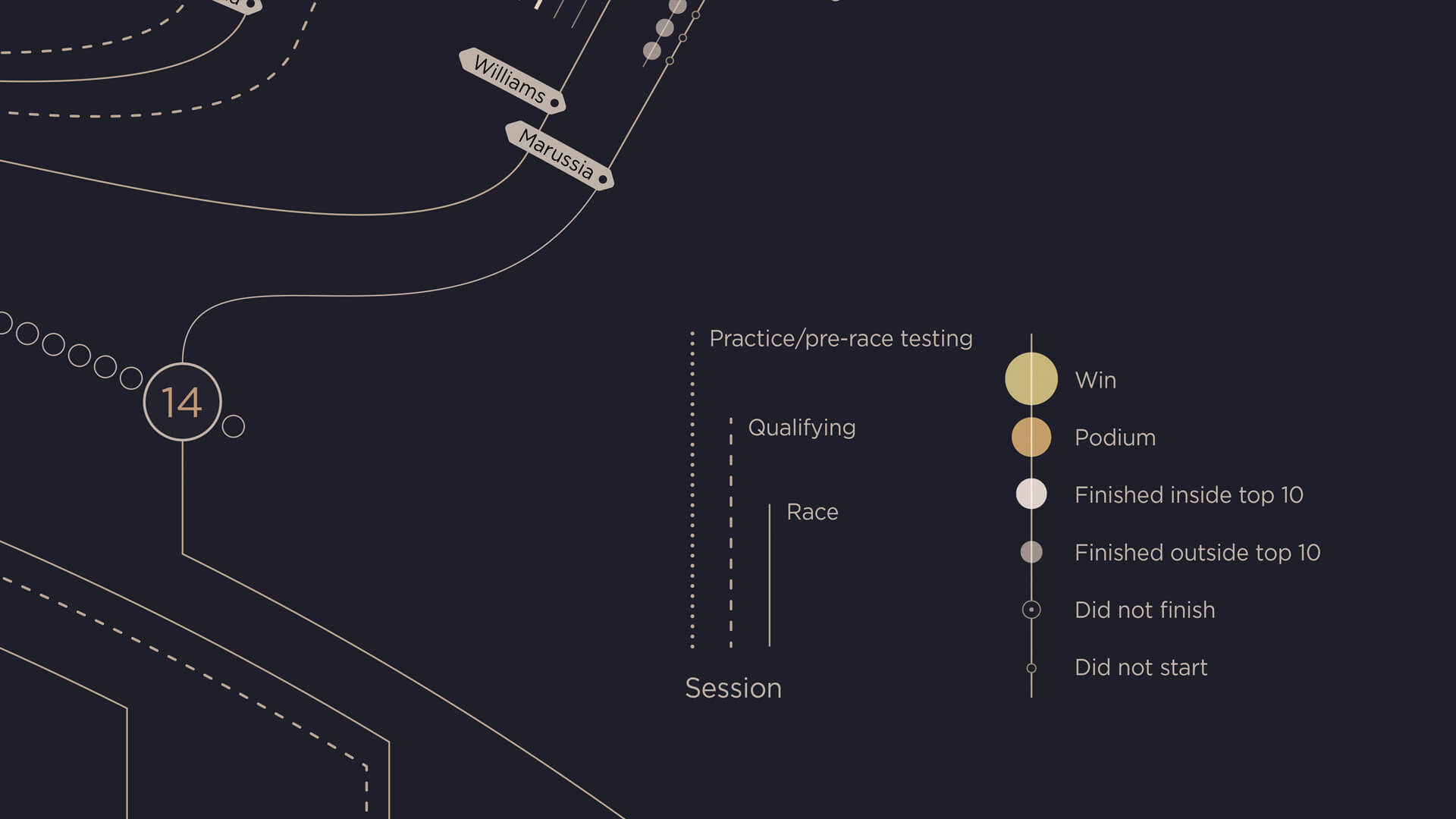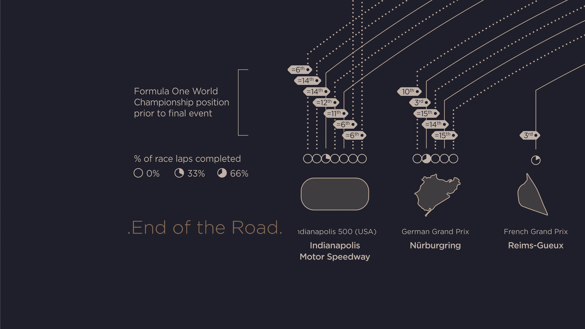 By visualising driver career achievements, team, championship position and race circuits, we were able to shape some intriguing stories across a rich data visualisation landscape. The visual shaping and colour aesthetics were carefully crafted to subtly symbolise a racing drivers dashboard whilst allowing a reader to absorb a dense amount of information quickly. The final output has been developed as a wall piece, one that is appreciated and admired on infogr8’s studio walls today.