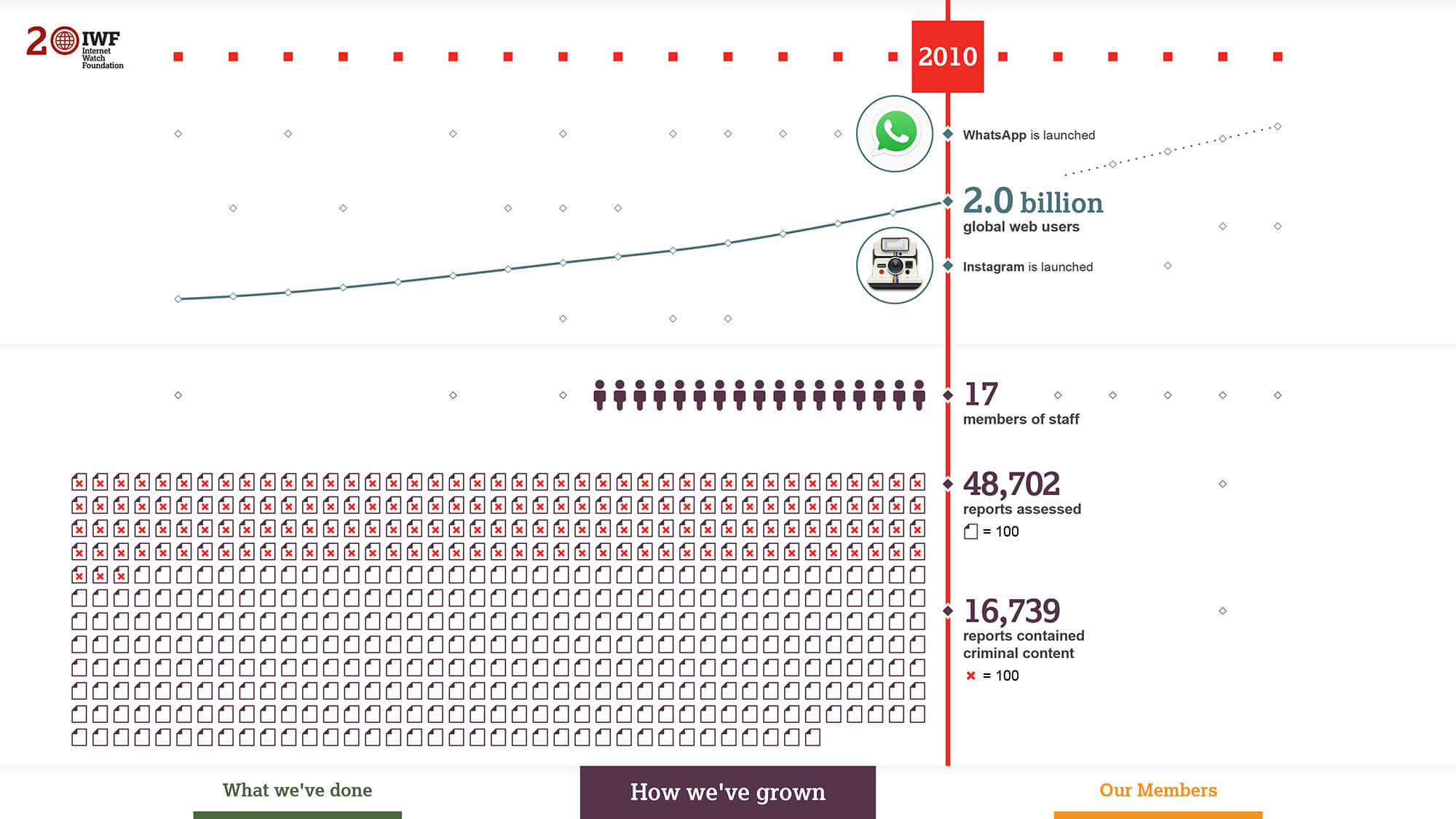 Sifting through the years highlights many important milestones, including the introduction of online reporting and the launch of their Image Hash List which allows duplicated images to be tracked and prevented from being uploaded. The colossal number of reports processed over the years, as well as an explosion in the number of Members partnering with the IWF can also be perused using the tabs at the bottom of the screen.