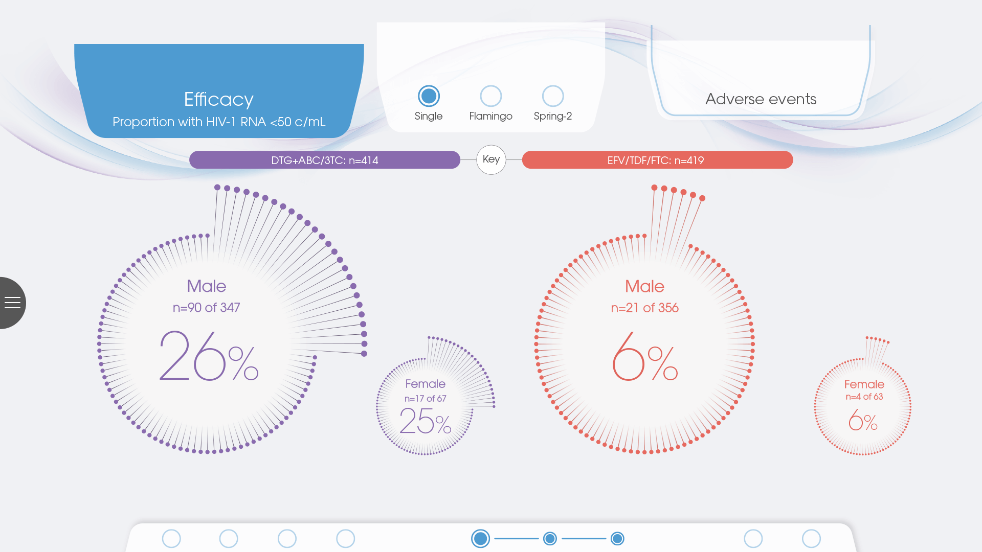 Once the data had been reviewed it was decided that the data from all 3 late-phase clinical trials of dolutegravir would be included to provide the most comprehensive picture, that could allow users to switch between each trial and compare against the current HIV treatment landscape. We would also allow the user to explore data from various stages across each trial, with filters applied to provide a deeper understanding of results across specific demographics.