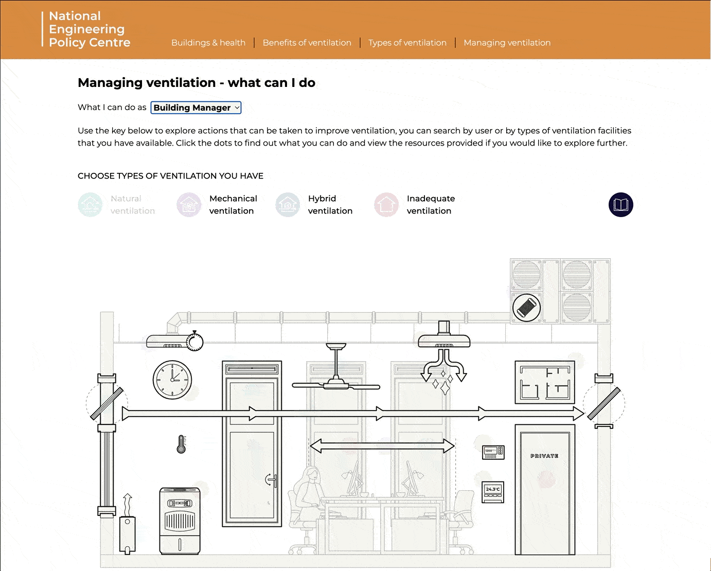 Our solution – Ventilation matters – explores why effective ventilation indoors is so crucial to the health and wellbeing of building occupants. It also offers a visual yet detailed account of the steps that can be taken in various settings to improve indoor air quality. For example, viewers can explore suggested actions and existing guidance by user type or by the forms of ventilation facilities available.