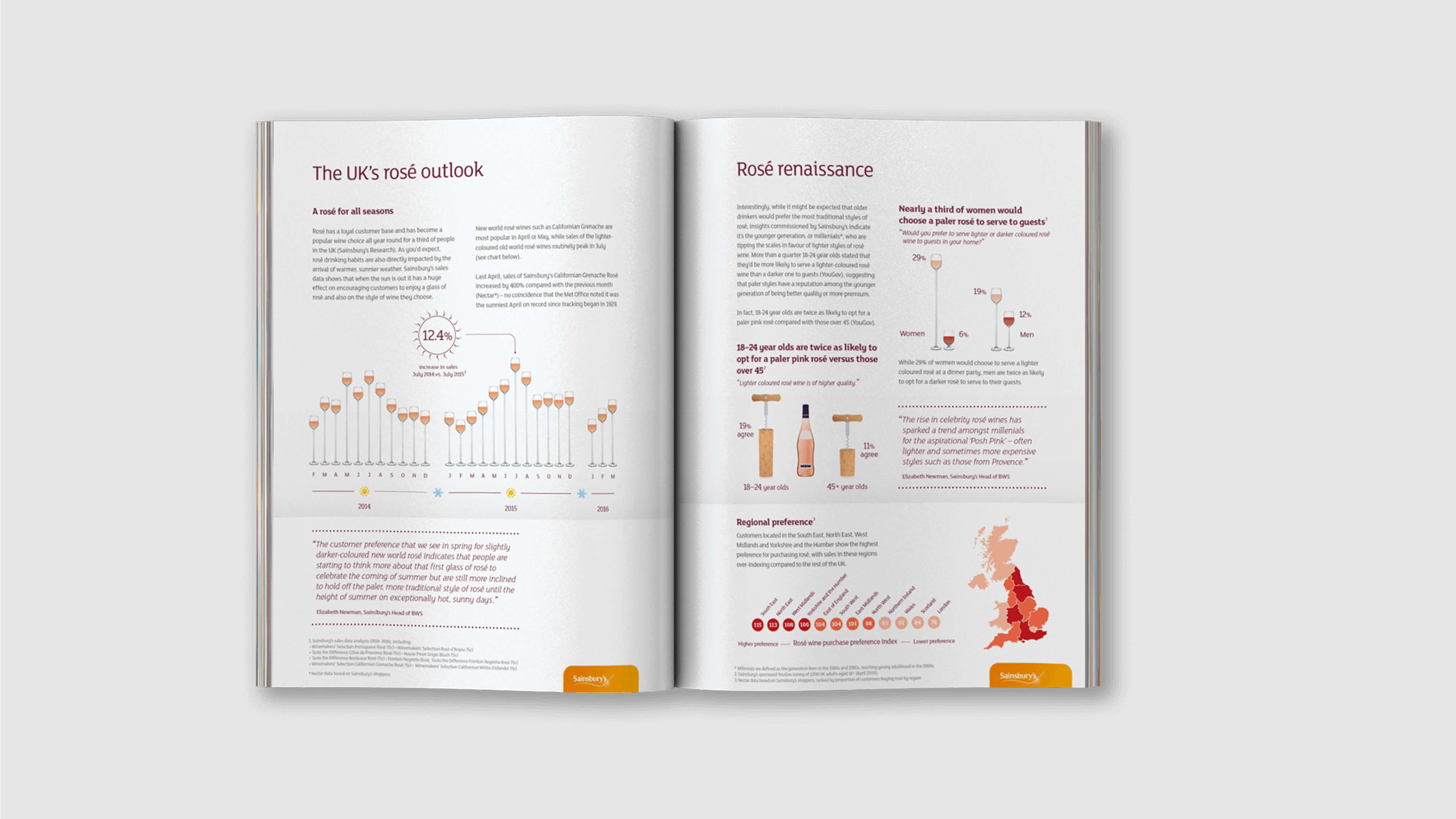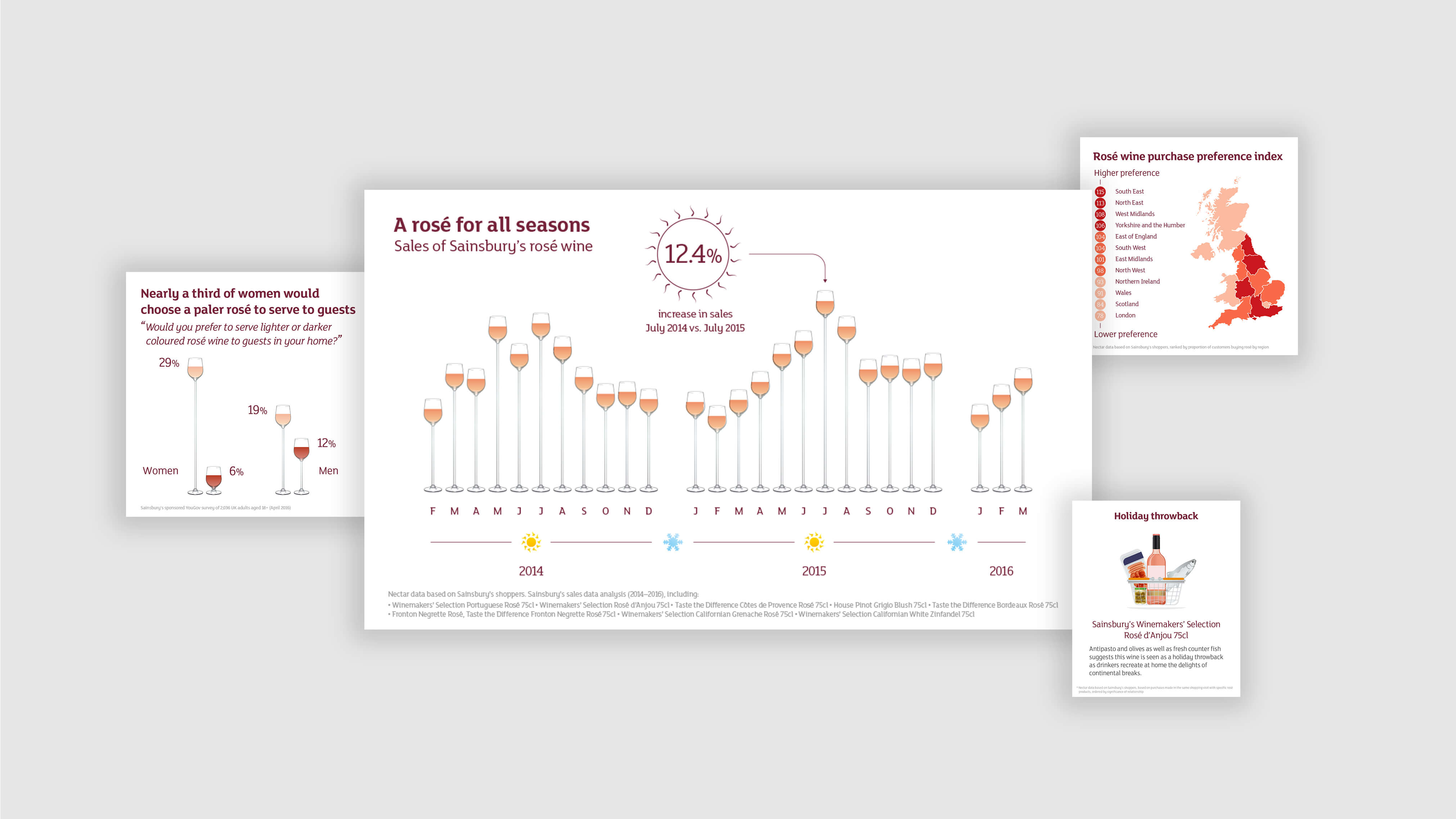 Not anymore – it now accounts for one in ten of all still wines sold at Sainsbury’s. In France, it outsells white wine. StoryPR approached us on behalf of Sainsbury’s to collaborate on a visual report on the outlook for rosé wine. The aim was to position Sainsbury’s at the forefront of the beers, wines and spirits industry as a brand that understands what their audience is drinking – and also stocks 55 different bottles of the pink stuff.