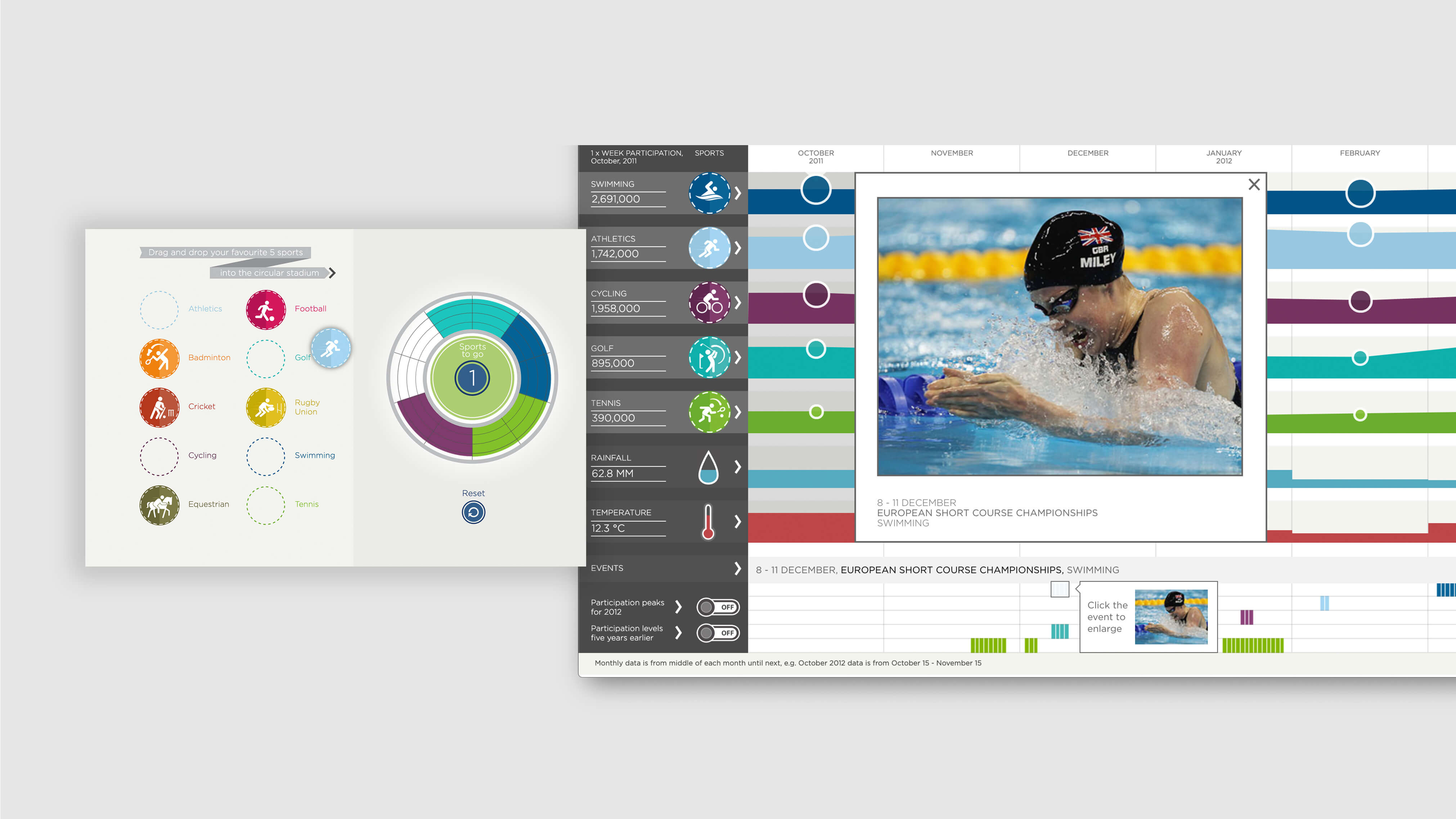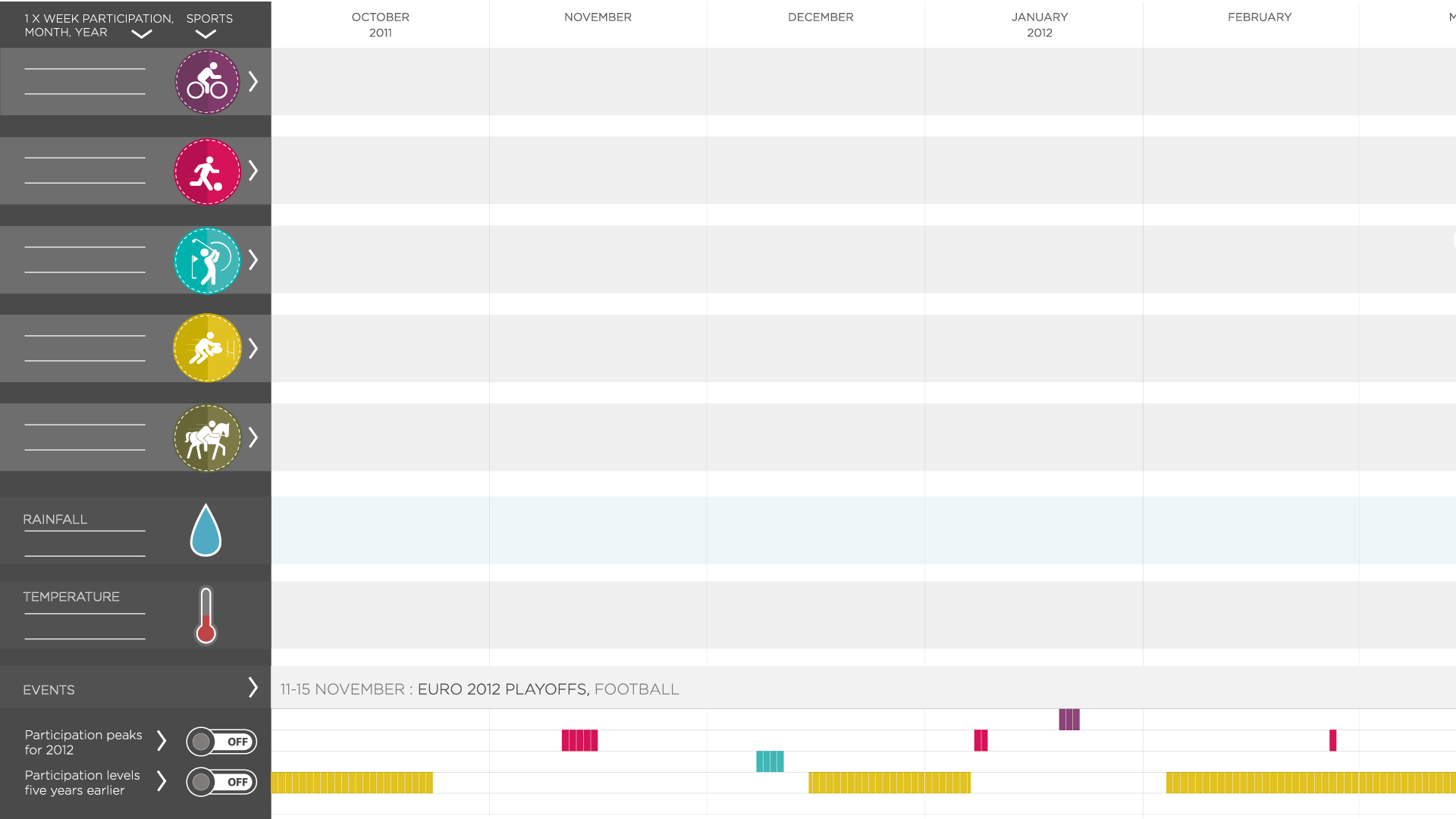 The interactive also looks at how external events might influence sports participation. We include data on temperature and rainfall from the Met Office for 2011/12 to highlight the seasonal patterns in sport participation further. And we display the dates of professional events in each sport’s annual calendar.