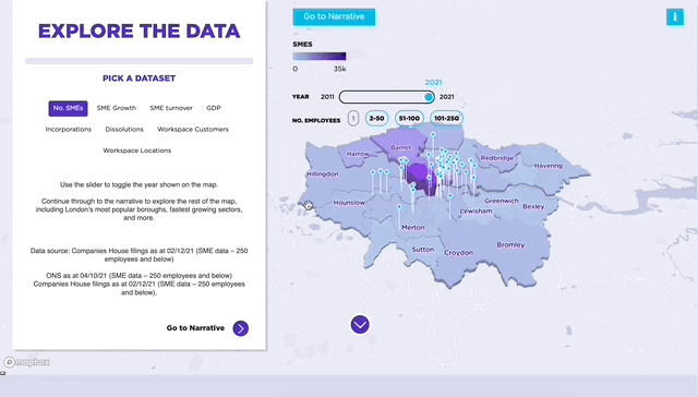 A modern, intuitive and data rich interactive map of London summarising the key trends of SME activity within each borough. There is the option to deep dive into different data sets including number of business startups, the sectors and turnover. Workspace customers and the success stories identify a compelling and easily digestible view of the overall trends. The accompanying narrative on key topics such as evolving working trends is supported by bold and digestible viusalisations. We developed an interactive, fast loading and responsive website using modern Mapbox GLJS and D3 JavaScript libraries. The overall look and feel represents the Workspace brand, bringing people to the fore and positioning Workspace as the ‘home of London’s brightest businesses’. The modular format enables Workspace to easily update the tool in the future, add in new data sets and identify key trends as the Capital’s economy continues its recovery.