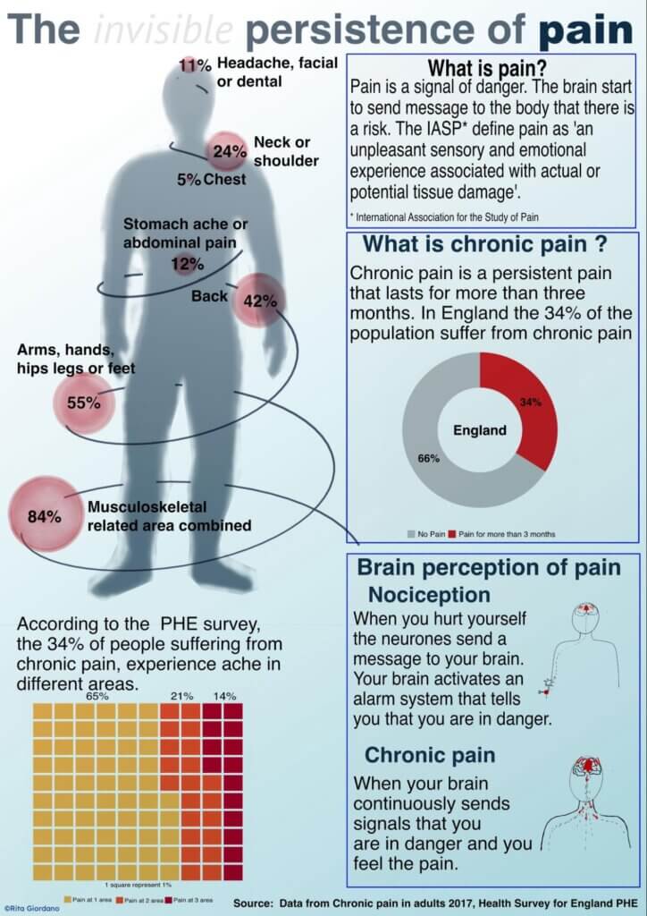 To make the infographics easy to understand, I used a different way of writing percentages in the infographics. For example, rather than saying “34% of the population aged over 16 and over suffer from chronic pain”, I used: “One in three people aged 16 and over suffer from chronic pain.” In this particular instance, the removal of the percentage and the use of the notation one in three renders the numbers more comprehensible.