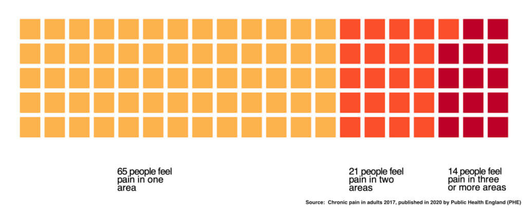 Figure 3: Waffle chart showing in how many areas people suffer pain. From ‘The invisible persistence of pain’ infographic. Designed by the author.