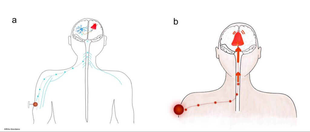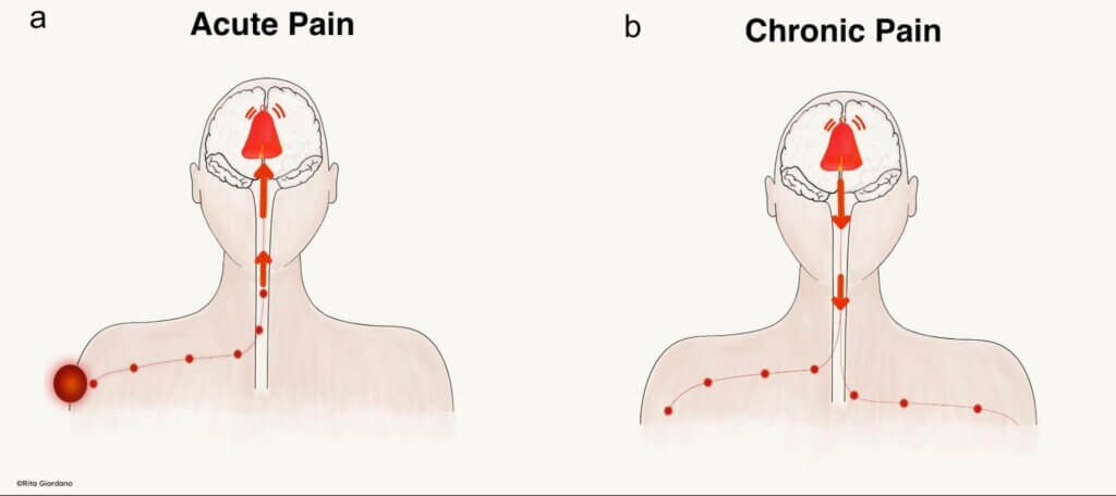 Chronic or persistent pain is a pain that persists during the normal time of healing. The IASP defines chronic pain as a pain that persists for more than three or six months (4). We can further classify pain by distinguishing between acute and chronic pain. Acute pain is, for example, when we prick ourselves with a needle. We immediately feel the pain. In this case, the neurons send an impulse to the brain that lets us know that there is a danger (Figure 1 a). So we feel the pain. In the case of chronic pain, there is no immediate danger, but our brain continues to send the stimulus that we are in danger, and we continuously feel the pain (Figure 1 b). This does not mean that the pain is just in our heads; the pain and the sensation are both real.