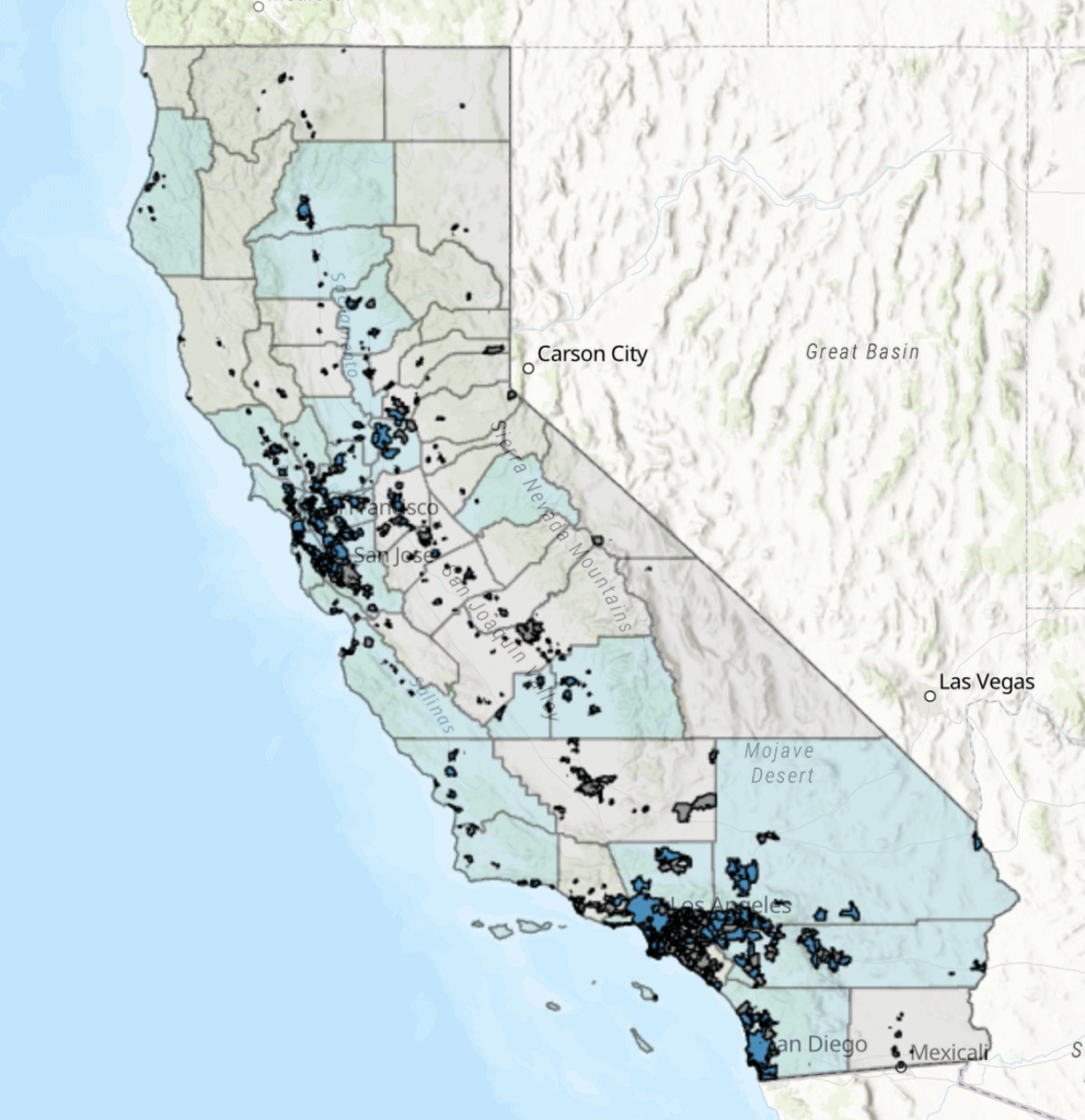 Climate action plans are strategic roadmaps for reducing greenhouse gas emissions. This map from the California Air Resources Board visualises climate action planning throughout California at the city and county levels.