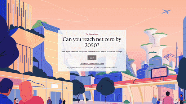 My choice for ‘Viz of the Year’ 2022 has to be The Climate Game created by the Financial Times in partnership with Infosys. The Climate Game uses a gamification approach to get users to choose their persona as a global minister making crucial decisions to keep the planet below the 1.5°C increase in global warming by 2050.
